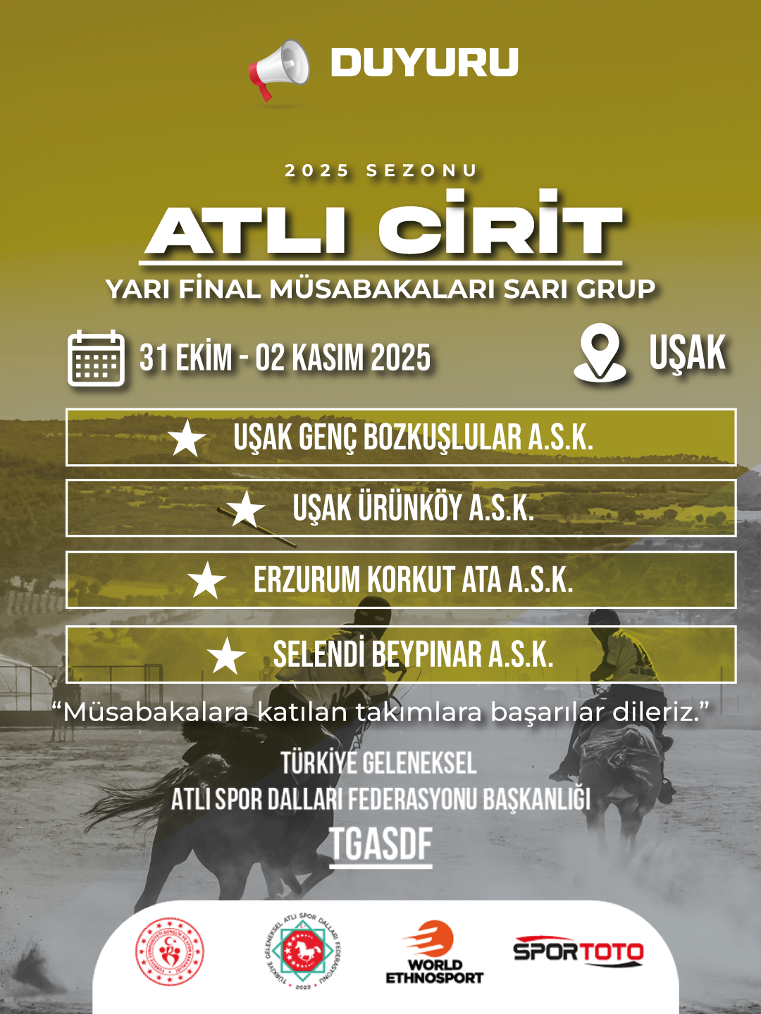 26 Ekim 2025 Tarihinde Afyonkarahisar’da gerçekleştireceğimiz Rahvan Binicilik Türkiye Şampiyonası Müsabakalarının katılımcı isim listeleri ektedir. Müsabakalara katılacak olan tüm at sahibi, binici ve antrenörlerimize, müsabakaları yönetecek olan hakemlerimize başarılar dileriz. […]
