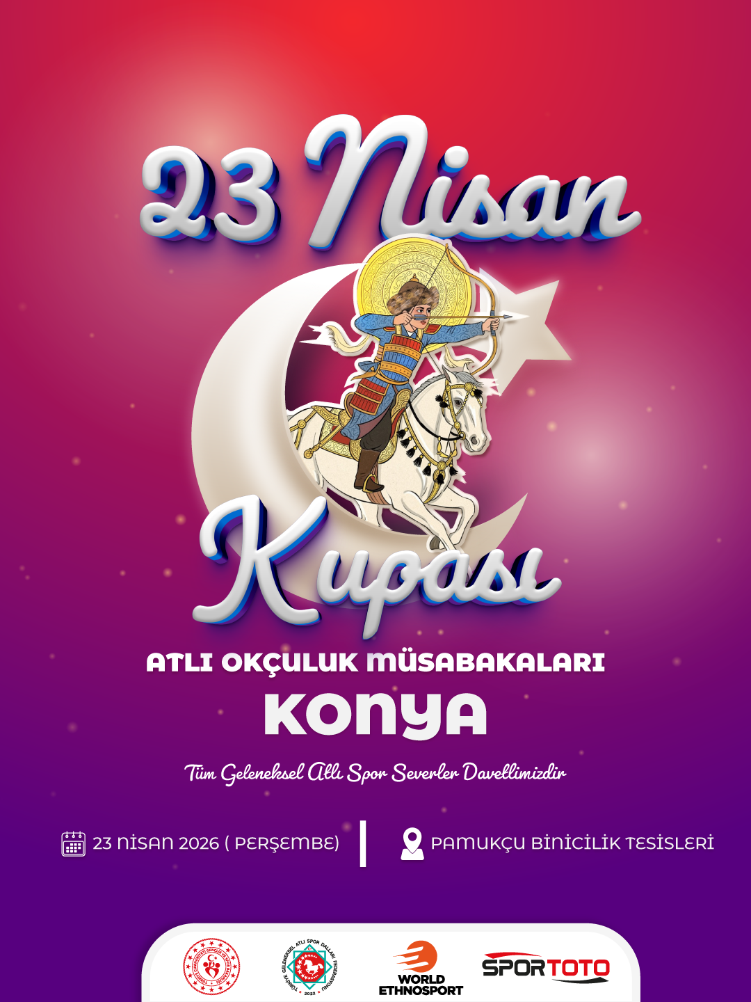 23 Nisan 2026 tarihlerinde Pamukçu Binicilik Tesislerinde düzenlenecek olan 23 Nisan Kupası | Ulusal Egemenlik ve Çocuk Bayramı Atlı Okçuluk Müsabakaları’ nın online kayıt formu bağlantıları aşağıdadır.