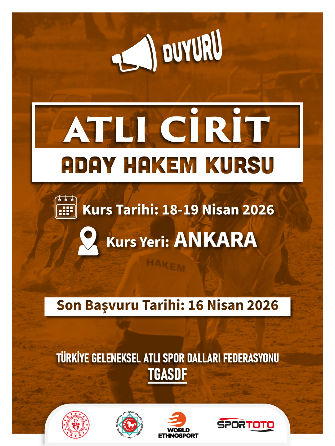 18-19 Nisan 2026 tarihinde Ankara’da Atlı Cirit Aday Hakem Kursu düzenlenecektir. Aday Hakem Kursuna Katılacak olan adaylar, Aday Hakem Kursu Başvuru Şartları ve Hakem Bilgi Formuna aşağıdaki bağlantılardan ulaşabilirler.