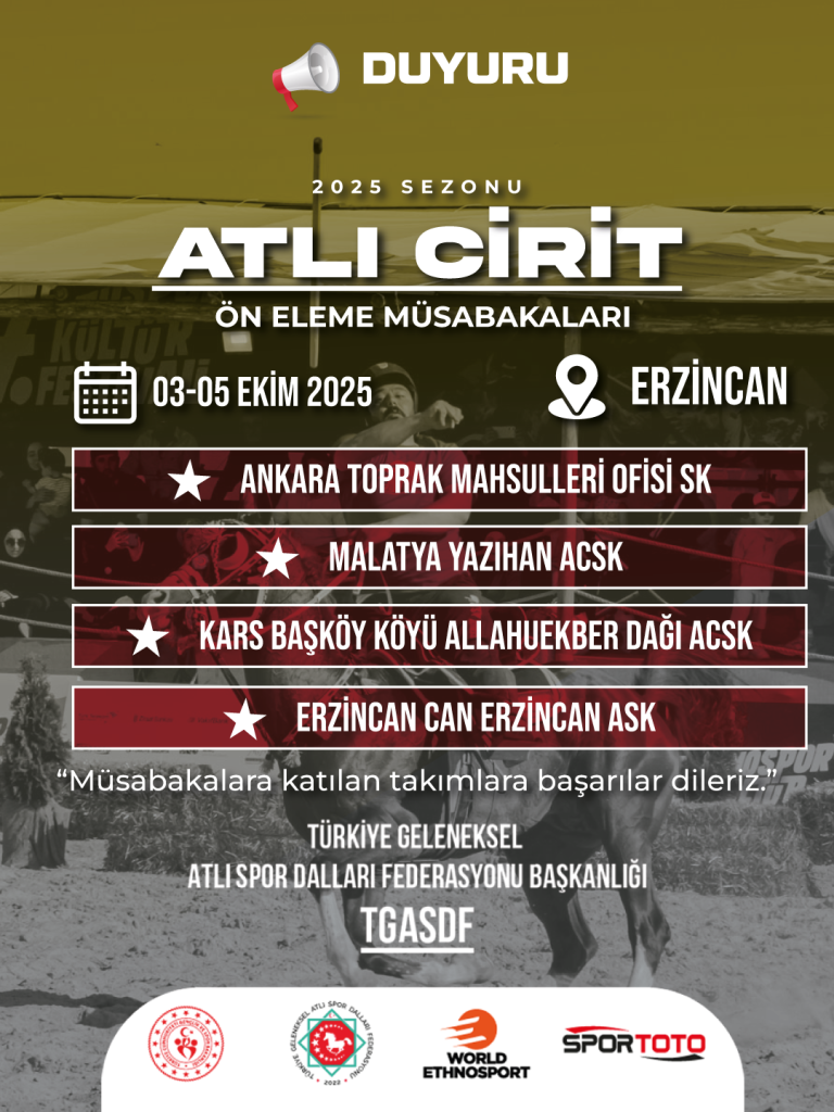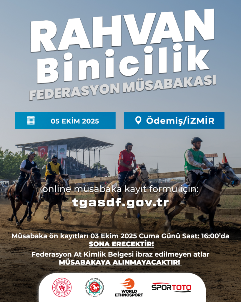 14 Eylül 2025 Tarihinde Osmancık/Çorum’da gerçekleştireceğimiz Rahvan Binicilik Federasyon Müsabakalarımıza katılacak olan tüm at sahibi, binici, hakem ve çalışma arkadaşlarımıza başarılar dileriz. Türkiye Geleneksel Atlı Spor Dalları Federasyonu…