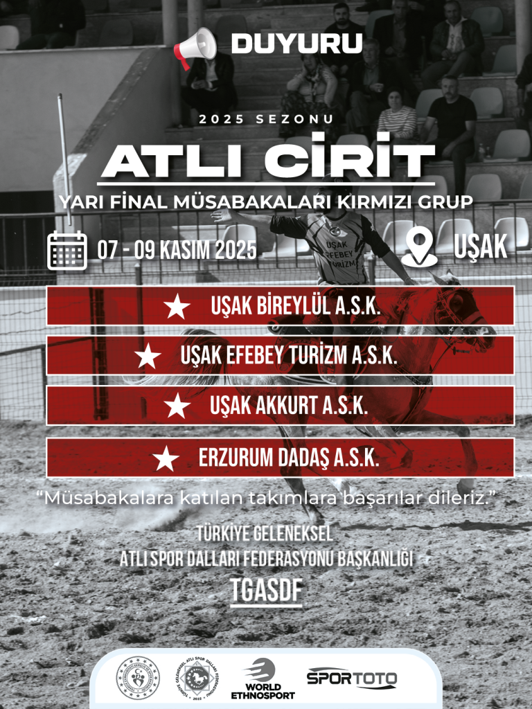 Atlı Cirit Türkiye Şampiyonası Final Müsabakaları 08-10 Kasım 2024 | ANKARA Müsabakalara Katılacak Takımlarımıza Başarılar Dileriz Türkiye Geleneksel Atlı Spor Dalları Federasyonu Başkanlığı TGASDF