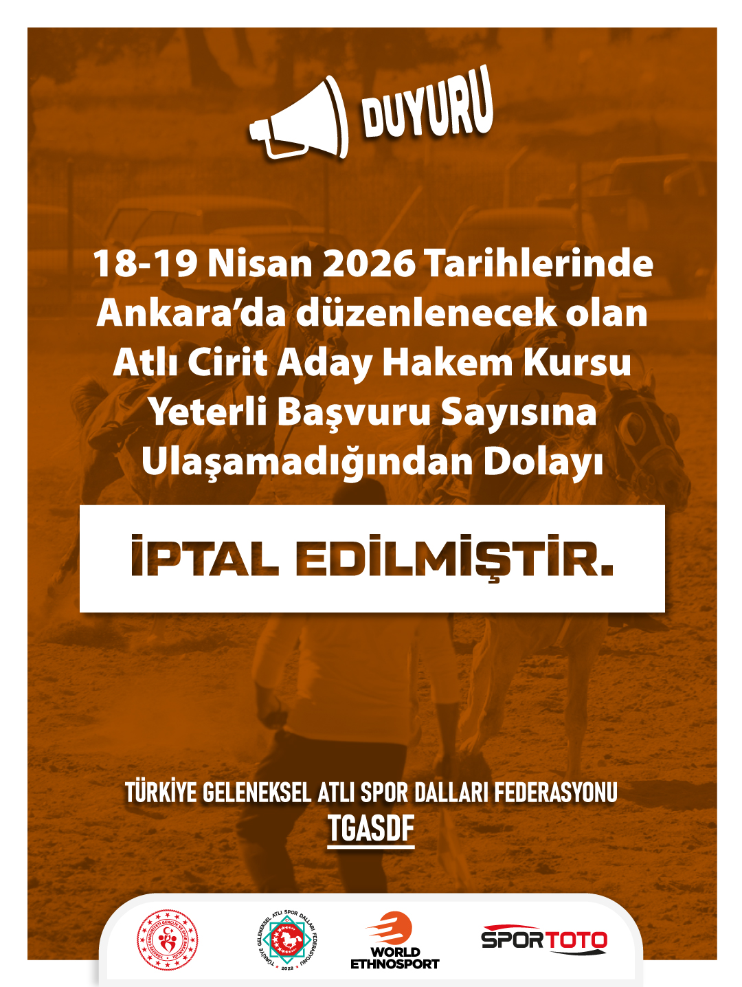 18-19 Nisan 2026 tarihlerinde Ankara Yenimahalle Spor Kompleksin’de düzenlenecek olan Atlı Cirit Aday Hakem Kursu yeterli Başvuru Sayısına ulaşamadığından dolayı iptal edilmiştir.
